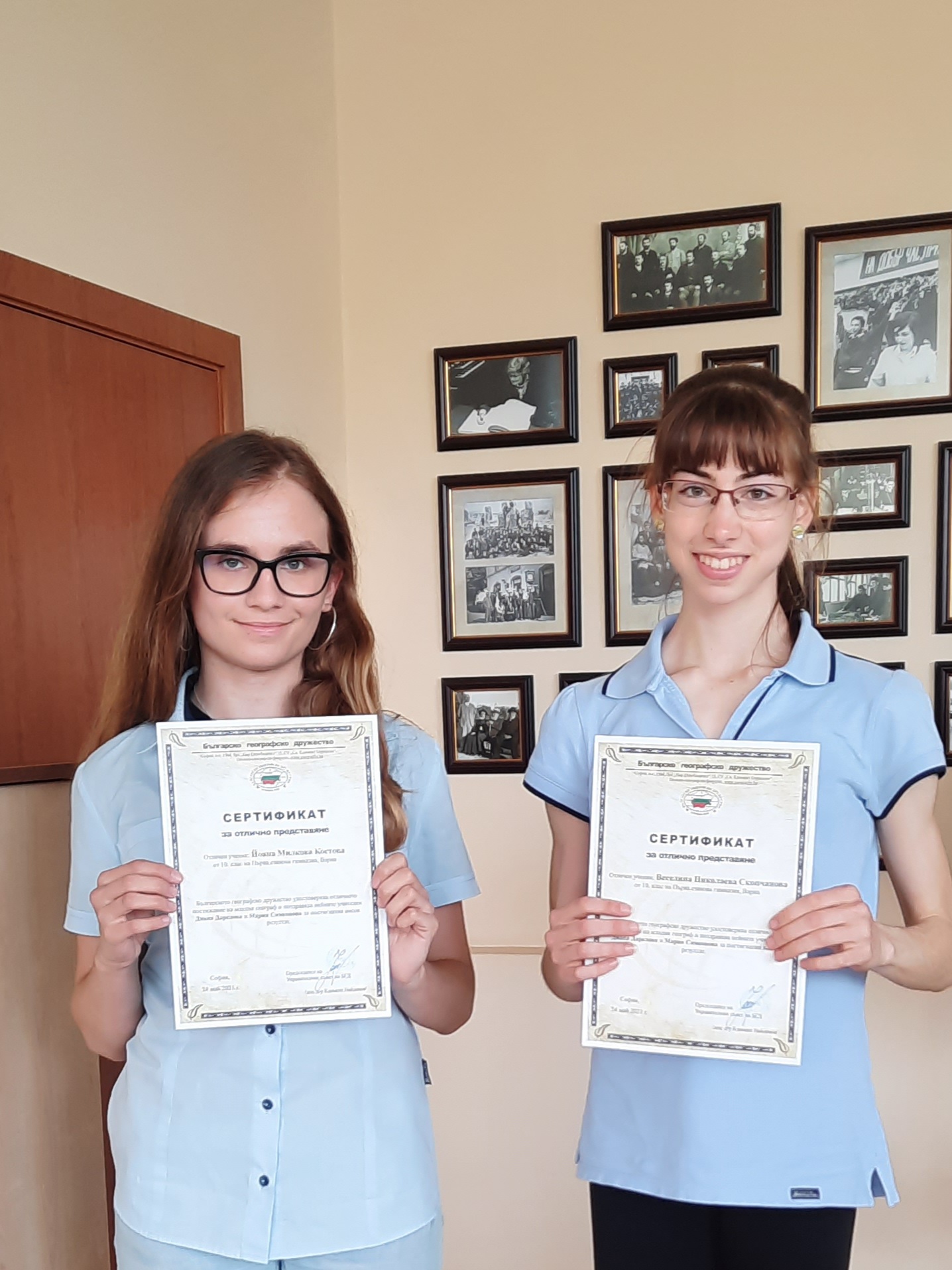 По повод 24 май – Ден на светите братя Кирил и Методий, на българската азбука, просвета и култура и на славянската книжовност, Българското географско дружество отличи 153 ученици от 62 учебни заведения на цялата страна за отлично представяне на олимпиади и състезания по география през годината. Сред отличените ученици са и възпитаничките на Първа ЕГ Йоана Костова от 10.в и Веселина Скопчанова от 10.г клас.