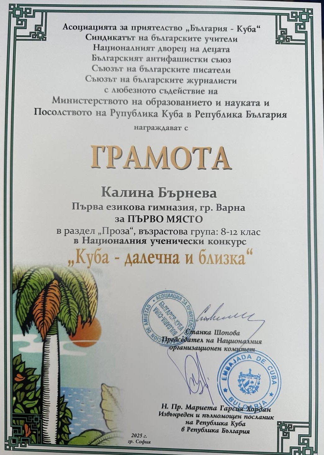 Поздравяваме Калина за постижението и ѝ пожелаваме още много вдъхновения и успехи по пътя на знанието и творчеството!