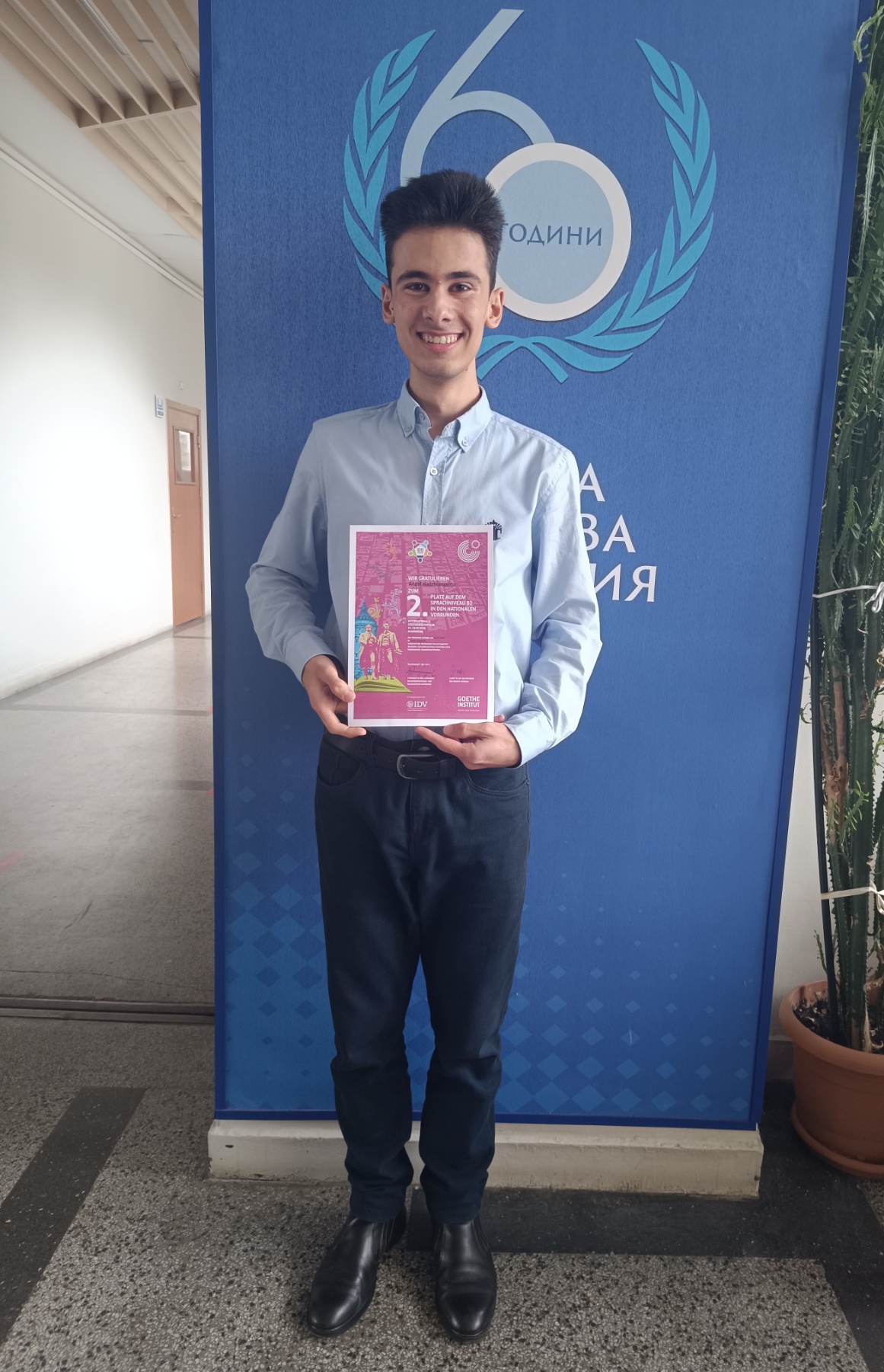 На 21 март 2026 година в Гьоте-институт – София се проведе националният квалификационен кръг на Международната олимпиада по немски език (IDO). Състезанието има за цел да провери не само езиковите познания, но и социалните умения на участниците на нива A2 и B2. Участниците бяха разделени в две категории според нивото на владеене на езика. В категория B2 се състезаваха 18 ученици от цялата страна. Олимпиадата премина под формата на устен изпит. Разделени на групи по трима, учениците подготвяха и представяха презентация по зададена тема. Формата на представяне беше по избор на участниците – дискусия, малка театрална постановка, токшоу или скеч, което направи състезанието изключително интересно и разнообразно. С гордост съобщаваме, че Ангел Хаджиангелов от 10.з клас се класира на второ място, което сподели с още един участник. Поздравяваме Ангел за отличното представяне и му пожелаваме още много успехи!