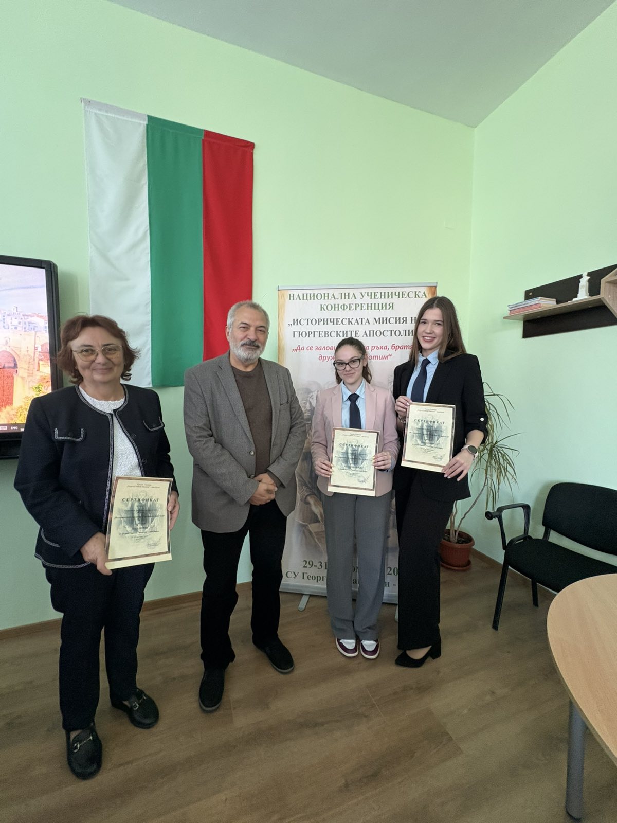 Отлично представяне на наши ученици на Националната ученическа конференция по история в Котел, посветена на 150 години от създаването на Гюргевския комитет. Ученици от школа „История“ под ръководството на госпожа Нела Димова взеха участие в Националната ученическа конференция по история, проведена в гр. Котел. Всички участници представиха свои авторски презентации и впечатлиха журито със задълбочена подготовка и увереност. Част от журито бяха проф. Пламен Митев от СУ и държавен експерт Радостина Николова от МОН. С гордост съобщаваме, че Калина Бърнева завоюва първо място, отличена за високото академично ниво на своята разработка и оригинален подход. Много силно се представиха и Вяра Маринова, Виктория Василева и Богдан Алексиев, които също защитиха своите презентации на високо научно и професионално ниво, заслужавайки признанието на организаторите и преподавателите. Гордеем се с техните постижения и стремеж към знания. Нашите ученици доказват, че трудът, амбицията и любознателността водят до успехи на национална сцена.