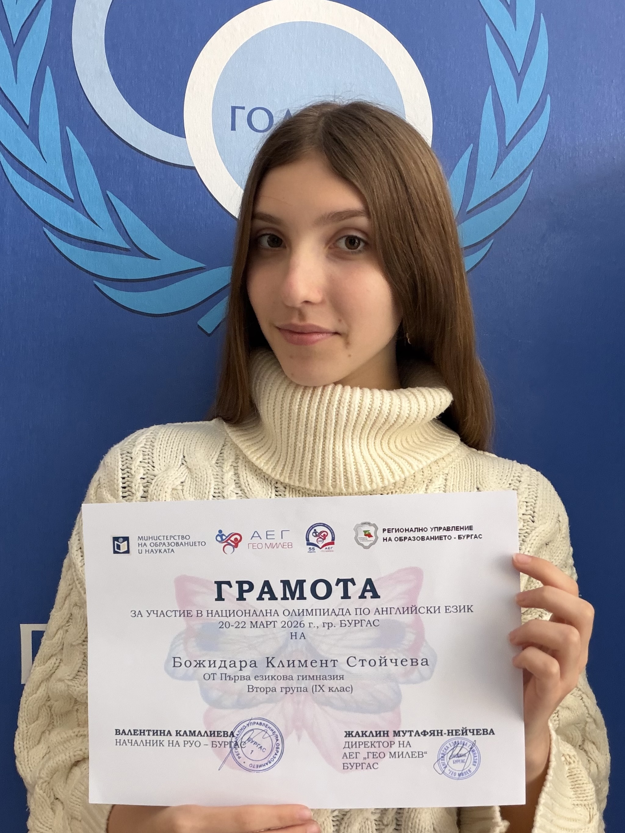 С гордост отбелязваме участието и достойното представяне на Божидара Климент Стойчева от 9.б клас на националния кръг на олимпиадата по английски език, който се проведе на 21 март. Освен че показва отлични знания по езика, Божидара е сред най-активните ученици в гимназията и изявен член на училищния клуб по дебати. Поздравяваме я за труда и постоянството!