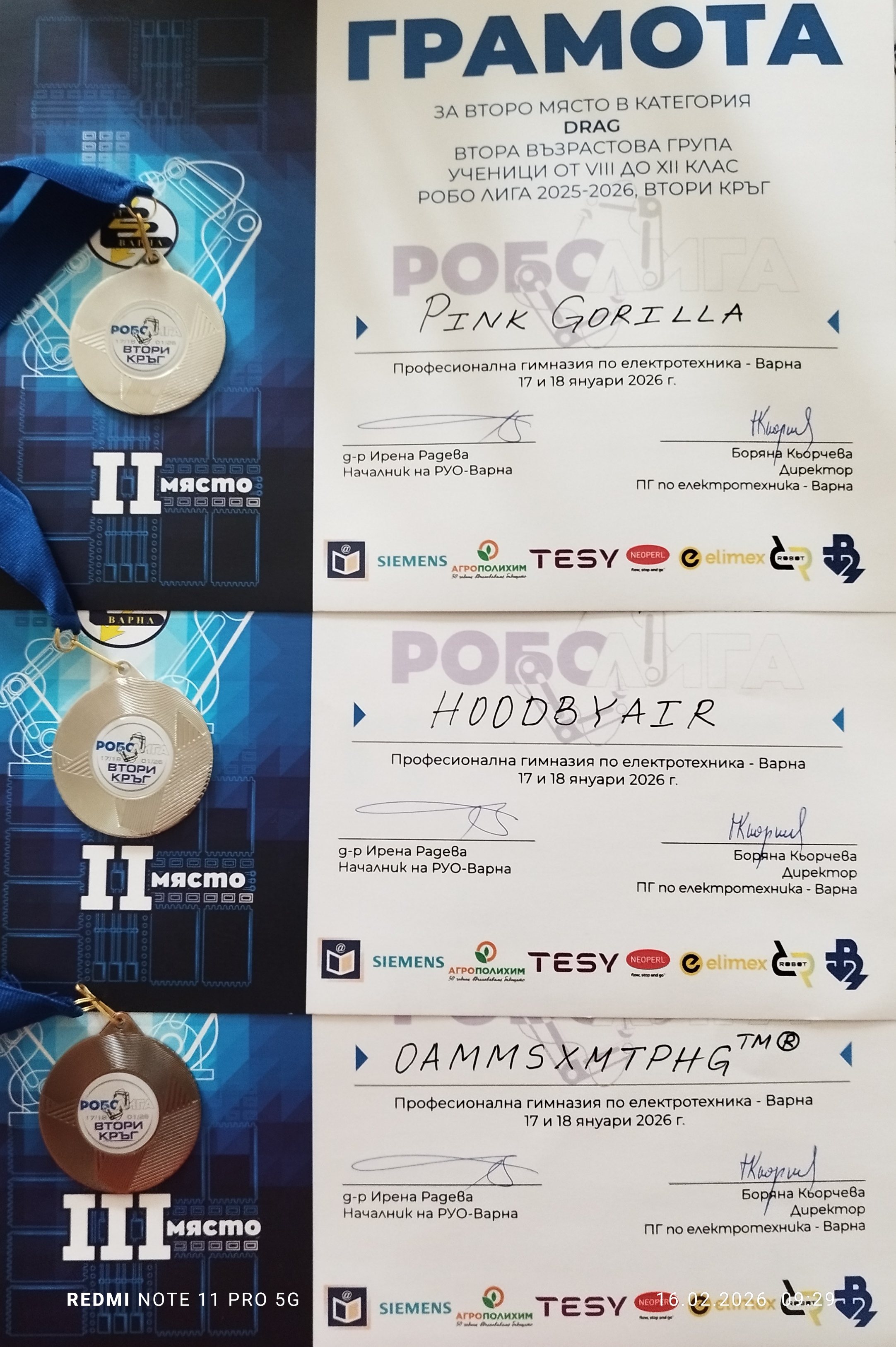 В крайното класиране за трите кръга на състезанието „Робо Лига“ отбор H00DBYAIR (Браян Бахчеванов, Александър Русев и Лъчезар Христов от 9.д) зае III място в категория СЛЕДЕНЕ НА ЛИНИЯ (роботи, направени от участниците). Отбор Pink Gorilla (Галена Галинова и Томислав Иванов от 9.д) се класира на I място в категория DRAG.