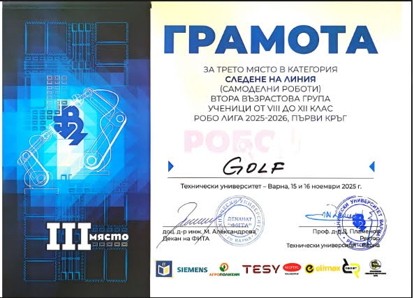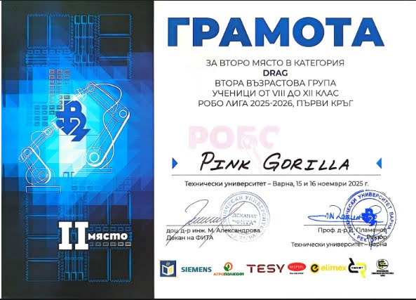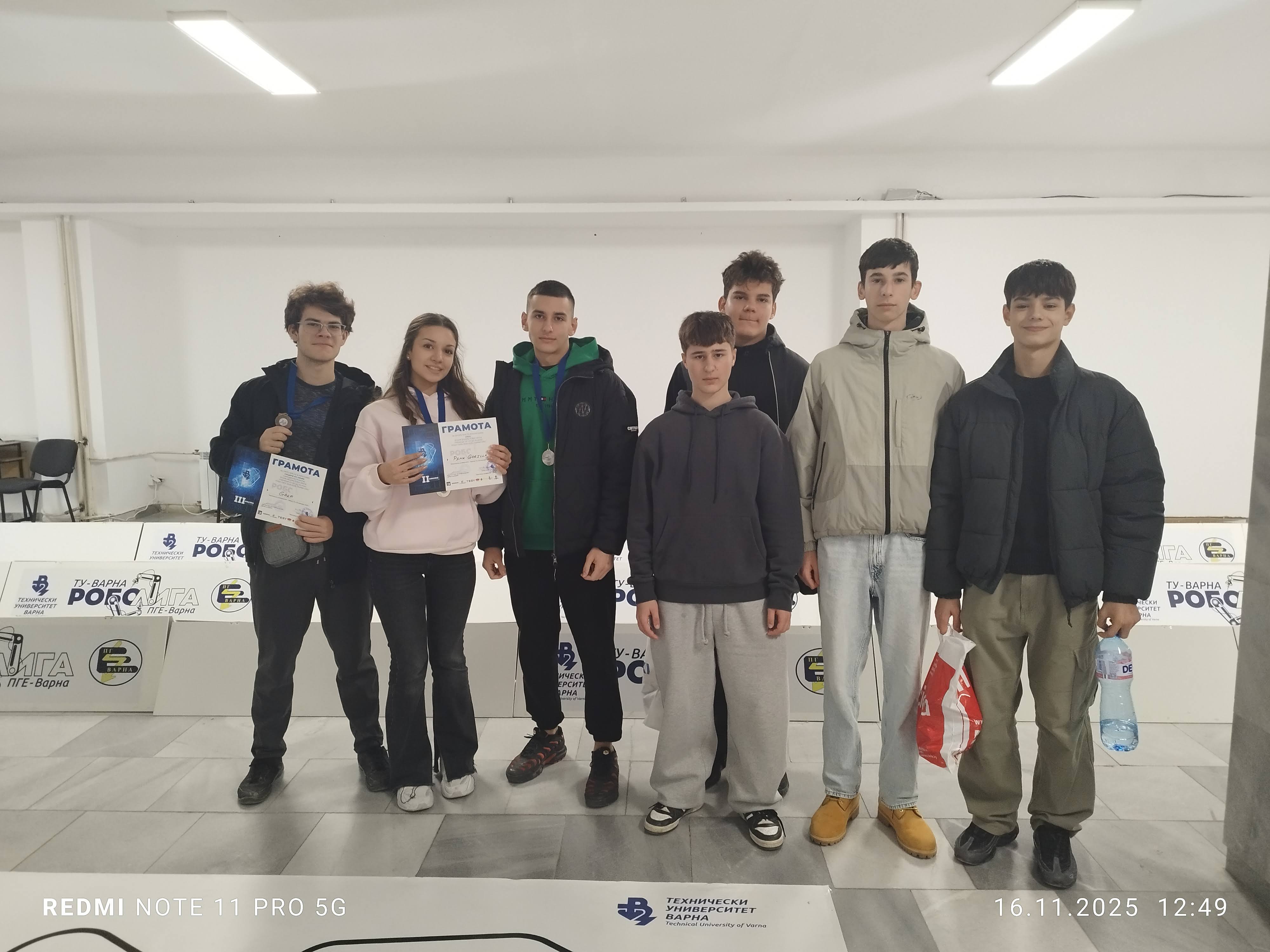 На 15 и 16 ноември се проведе първият кръг на състезанието „Робо Лига“ в ТУ – Варна. Първа езикова гимназията се включи с четири отбора. Отбор Pink Gorila - Галена Галинова и Томислав Иванов от 9.д, се класираха на II място в категория DRAG и III място в категория РОБО-РАЛИ. Отбор Golf - Константин Пенев от 12.д, зае III място в категория СЛЕДЕНЕ НА ЛИНИЯ (САМОДЕЛНИ РОБОТИ).