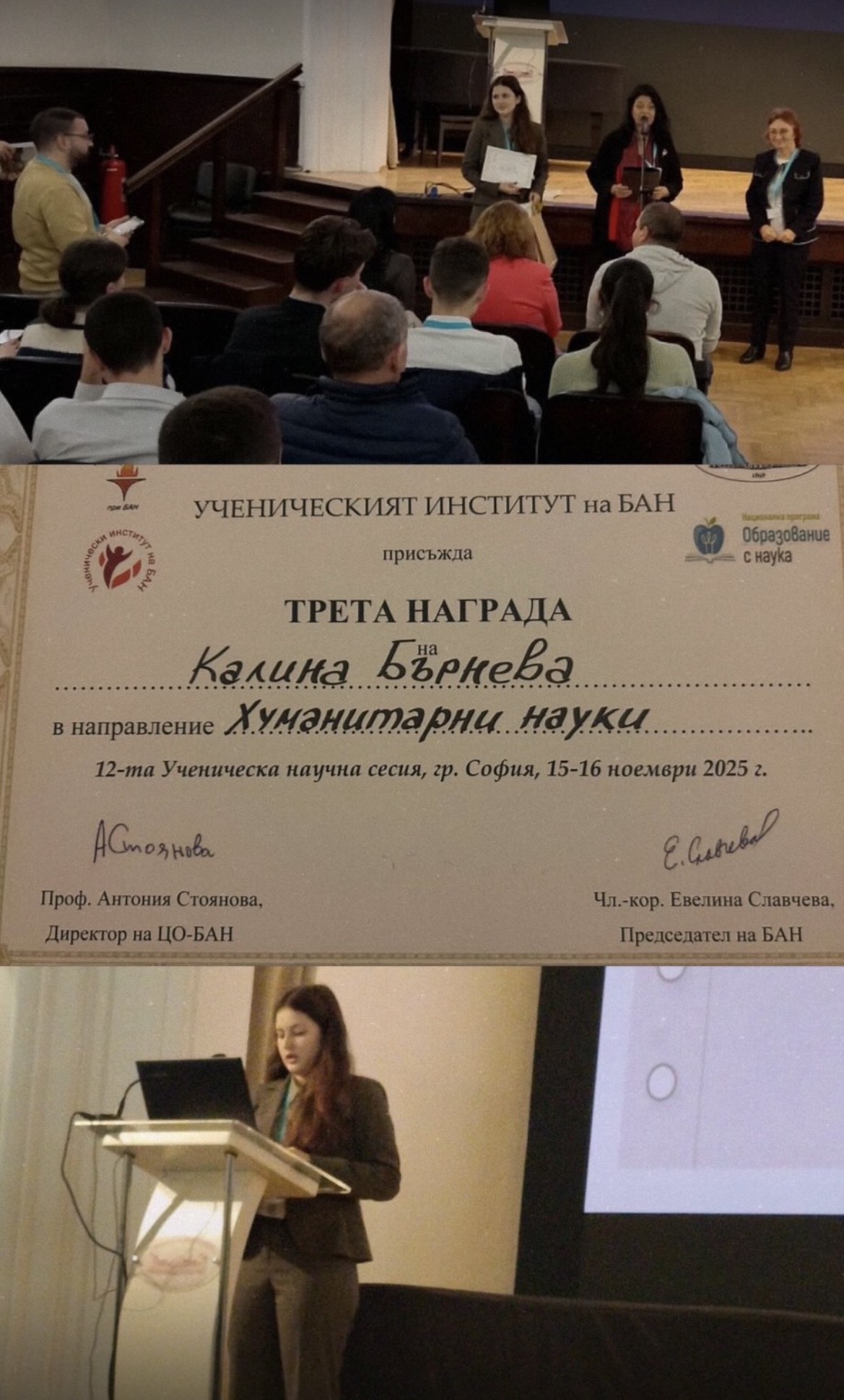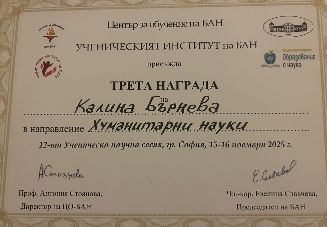 С истинска гордост споделяме, че седем ученици от нашето училище – Калина Бърнева, Вяра Маринова, Алекс Павлов, Виктория Виткова, Виктория Василева, Богдан Алексиев и Александър Желязков – се представиха блестящо на Ученическата научна конференция към Българската академия на науките, където бяха оценени от петчленно академично жури измежду 189 проекта. Те разработиха и защитиха 6 научни проекта, като всички преминаха успешно първото класиране и бяха допуснати до жива защита пред академична комисия. Резюметата на техните изследвания бяха отпечатани в официалната сборна книга на БАН – признание за високото качество и значимост на работата им. Във финалното класиране Калина Бърнева заслужено зае трето място, доказвайки отлична научна подготовка и впечатляваща презентационна култура.